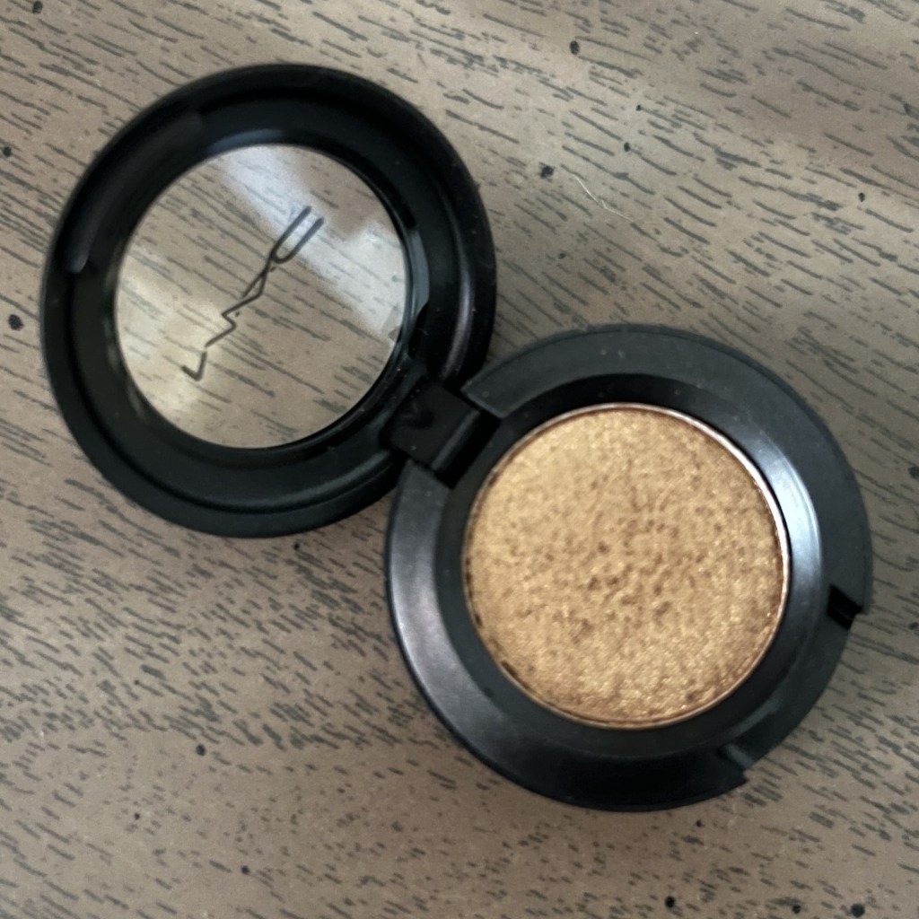 The color is a medium gold with a shimmer finish. Mac describes it as a peachy-brown shimmer. And on the box it is labeled as a Frost. That description fits it well. I like that it isn’t an orange gold like I was hoping that it wouldn’t be. I’m rekindling my love for gold eyeshadow with this one. Its what my younger self would have wanted. It’s a teenaged Amber’s dream. I would’ve put this all over my eyelids with deep black eyeliner on my top and bottom lashes along with sixty two layers of any brand of mascara in the shade “Blackest Black” and thought it was a “lewk”.